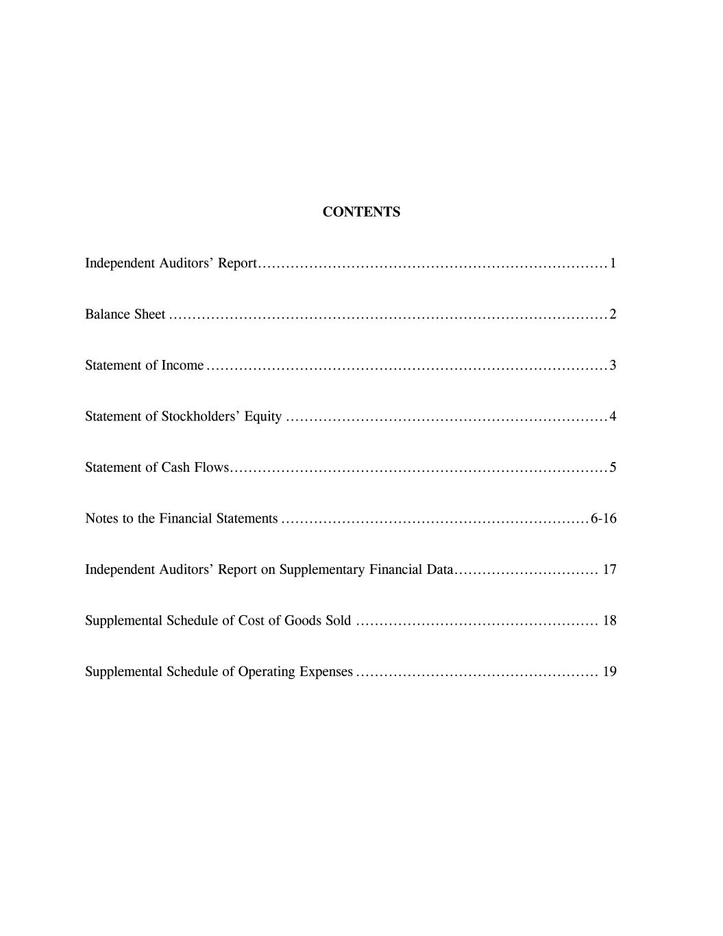 CONTENTS Independent Auditors’ Report ........................................................................... 1 Balance Sheet .............................................................................................. 2 Statement of Income ...................................................................................... 3 Statement of Stockholders’ Equity ..................................................................... 4 Statement of Cash Flows ................................................................................. 5 Notes to the Financial Statements .................................................................. 6-16 Independent Auditors’ Report on Supplementary Financial Data ............................... 17 Supplemental Schedule of Cost of Goods Sold .................................................... 18 Supplemental Schedule of Operating Expenses .................................................... 19