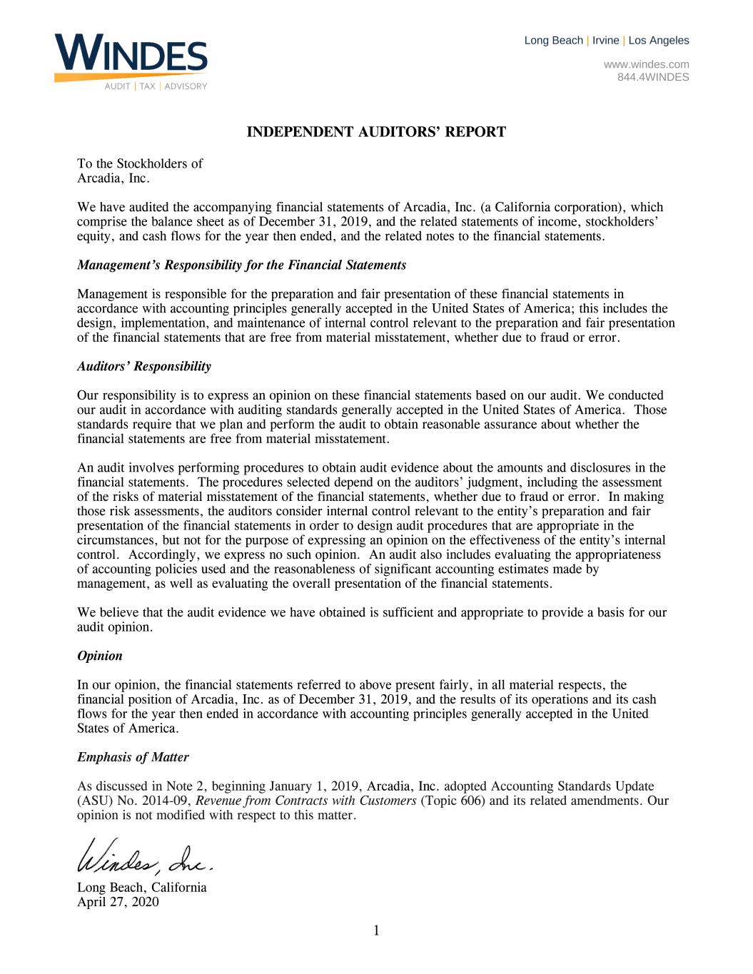 1 INDEPENDENT AUDITORS’ REPORT To the Stockholders of Arcadia, Inc. We have audited the accompanying financial statements of Arcadia, Inc. (a California corporation), which comprise the balance sheet as of December 31, 2019, and the related statements of income, stockholders’ equity, and cash flows for the year then ended, and the related notes to the financial statements. Management’s Responsibility for the Financial Statements Management is responsible for the preparation and fair presentation of these financial statements in accordance with accounting principles generally accepted in the United States of America; this includes the design, implementation, and maintenance of internal control relevant to the preparation and fair presentation of the financial statements that are free from material misstatement, whether due to fraud or error. Auditors’ Responsibility Our responsibility is to express an opinion on these financial statements based on our audit. We conducted our audit in accordance with auditing standards generally accepted in the United States of America. Those standards require that we plan and perform the audit to obtain reasonable assurance about whether the financial statements are free from material misstatement. An audit involves performing procedures to obtain audit evidence about the amounts and disclosures in the financial statements. The procedures selected depend on the auditors’ judgment, including the assessment of the risks of material misstatement of the financial statements, whether due to fraud or error. In making those risk assessments, the auditors consider internal control relevant to the entity’s preparation and fair presentation of the financial statements in order to design audit procedures that are appropriate in the circumstances, but not for the purpose of expressing an opinion on the effectiveness of the entity’s internal control. Accordingly, we express no such opinion. An audit also includes evaluating the appropriateness of accounting policies used and the reasonableness of significant accounting estimates made by management, as well as evaluating the overall presentation of the financial statements. We believe that the audit evidence we have obtained is sufficient and appropriate to provide a basis for our audit opinion. Opinion In our opinion, the financial statements referred to above present fairly, in all material respects, the financial position of Arcadia, Inc. as of December 31, 2019, and the results of its operations and its cash flows for the year then ended in accordance with accounting principles generally accepted in the United States of America. Emphasis of Matter As discussed in Note 2, beginning January 1, 2019, Arcadia, Inc. adopted Accounting Standards Update (ASU) No. 2014-09, Revenue from Contracts with Customers (Topic 606) and its related amendments. Our opinion is not modified with respect to this matter. Long Beach, California April 27, 2020 Long Beach | Irvine | Los Angeles www.windes.com 844.4WINDES