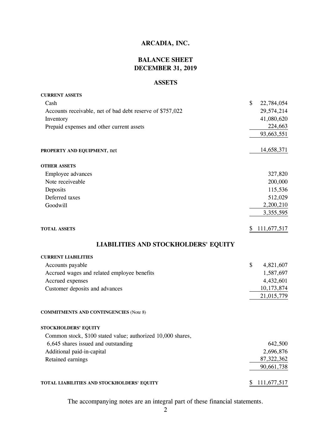 ARCADIA, INC. BALANCE SHEET DECEMBER 31, 2019 CURRENT ASSETS Cash 22,784,054$ Accounts receivable, net of bad debt reserve of $757,022 29,574,214 Inventory 41,080,620 Prepaid expenses and other current assets 224,663 93,663,551 PROPERTY AND EQUIPMENT, net 14,658,371 OTHER ASSETS Employee advances 327,820 Note receiveable 200,000 Deposits 115,536 Deferred taxes 512,029 Goodwill 2,200,210 3,355,595 TOTAL ASSETS 111,677,517$ CURRENT LIABILITIES Accounts payable 4,821,607$ Accrued wages and related employee benefits 1,587,697 Accrued expenses 4,432,601 Customer deposits and advances 10,173,874 21,015,779 COMMITMENTS AND CONTINGENCIES (Note 8) STOCKHOLDERS’ EQUITY Common stock, $100 stated value; authorized 10,000 shares, 6,645 shares issued and outstanding 642,500 Additional paid-in-capital 2,696,876 Retained earnings 87,322,362 90,661,738 TOTAL LIABILITIES AND STOCKHOLDERS' EQUITY 111,677,517$ LIABILITIES AND STOCKHOLDERS' EQUITY ASSETS The accompanying notes are an integral part of these financial statements. 2