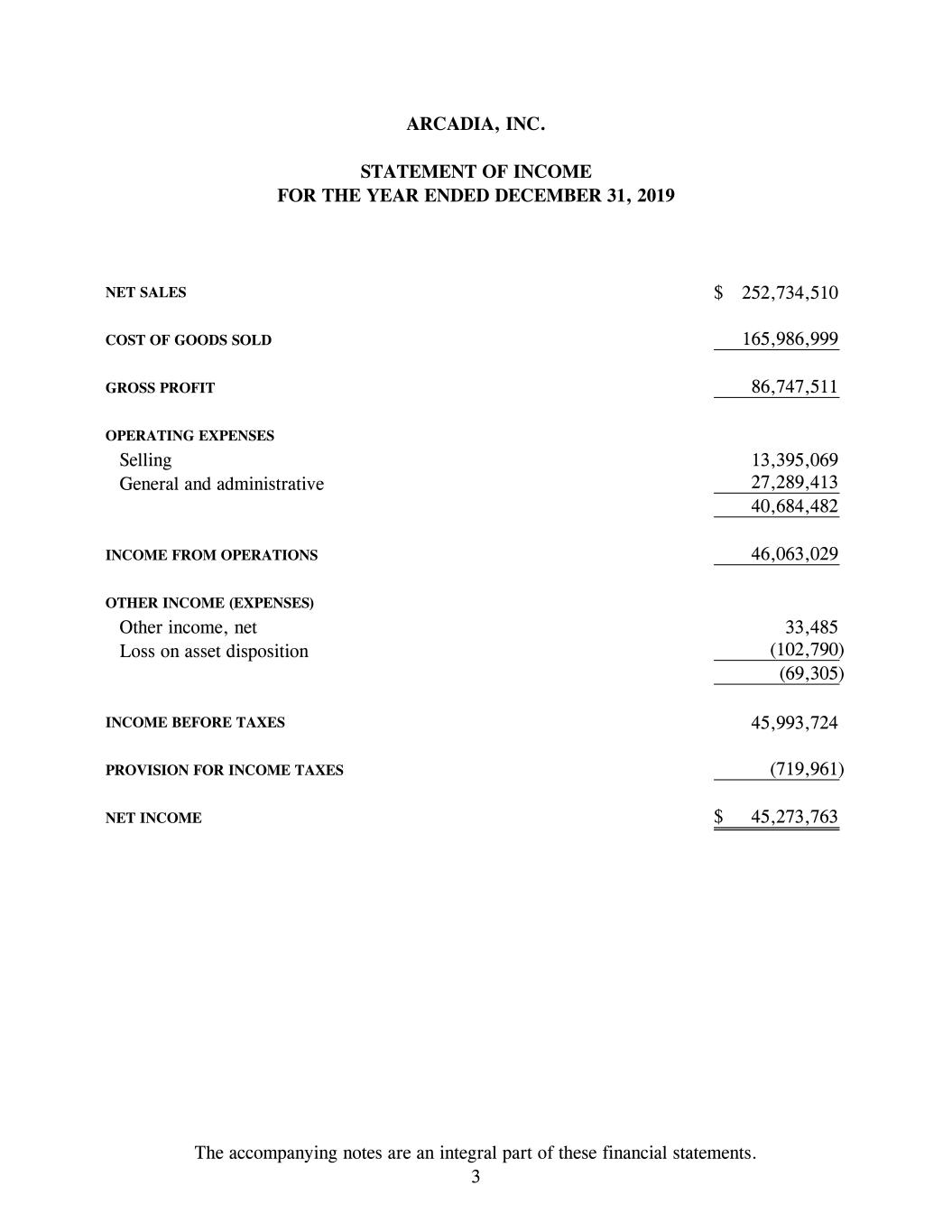 ARCADIA, INC. STATEMENT OF INCOME FOR THE YEAR ENDED DECEMBER 31, 2019 NET SALES 252,734,510$ COST OF GOODS SOLD 165,986,999 GROSS PROFIT 86,747,511 OPERATING EXPENSES Selling 13,395,069 General and administrative 27,289,413 40,684,482 INCOME FROM OPERATIONS 46,063,029 OTHER INCOME (EXPENSES) Other income, net 33,485 Loss on asset disposition (102,790) (69,305) INCOME BEFORE TAXES 45,993,724 PROVISION FOR INCOME TAXES (719,961) NET INCOME 45,273,763$ The accompanying notes are an integral part of these financial statements. 3