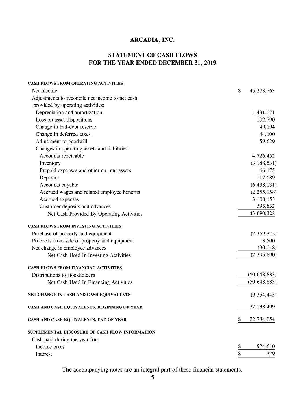 ARCADIA, INC. STATEMENT OF CASH FLOWS FOR THE YEAR ENDED DECEMBER 31, 2019 CASH FLOWS FROM OPERATING ACTIVITIES Net income 45,273,763$ Adjustments to reconcile net income to net cash provided by operating activities: Depreciation and amortization 1,431,071 Loss on asset dispositions 102,790 Change in bad-debt reserve 49,194 Change in deferred taxes 44,100 Adjustment to goodwill 59,629 Changes in operating assets and liabilities: Accounts receivable 4,726,452 Inventory (3,188,531) Prepaid expenses and other current assets 66,175 Deposits 117,689 Accounts payable (6,438,031) Accrued wages and related employee benefits (2,255,958) Accrued expenses 3,108,153 Customer deposits and advances 593,832 Net Cash Provided By Operating Activities 43,690,328 CASH FLOWS FROM INVESTING ACTIVITIES Purchase of property and equipment (2,369,372) Proceeds from sale of property and equipment 3,500 Net change in employee advances (30,018) Net Cash Used In Investing Activities (2,395,890) CASH FLOWS FROM FINANCING ACTIVITIES Distributions to stockholders (50,648,883) Net Cash Used In Financing Activities (50,648,883) NET CHANGE IN CASH AND CASH EQUIVALENTS (9,354,445) CASH AND CASH EQUIVALENTS, BEGINNING OF YEAR 32,138,499 CASH AND CASH EQUIVALENTS, END OF YEAR 22,784,054$ SUPPLEMENTAL DISCOSURE OF CASH FLOW INFORMATION Cash paid during the year for: Income taxes 924,610$ Interest 329$ The accompanying notes are an integral part of these financial statements. 5