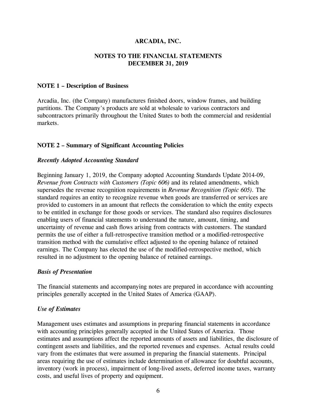 ARCADIA, INC. NOTES TO THE FINANCIAL STATEMENTS DECEMBER 31, 2019 6 NOTE 1 – Description of Business Arcadia, Inc. (the Company) manufactures finished doors, window frames, and building partitions. The Company's products are sold at wholesale to various contractors and subcontractors primarily throughout the United States to both the commercial and residential markets. NOTE 2 – Summary of Significant Accounting Policies Recently Adopted Accounting Standard Beginning January 1, 2019, the Company adopted Accounting Standards Update 2014-09, Revenue from Contracts with Customers (Topic 606) and its related amendments, which supersedes the revenue recognition requirements in Revenue Recognition (Topic 605). The standard requires an entity to recognize revenue when goods are transferred or services are provided to customers in an amount that reflects the consideration to which the entity expects to be entitled in exchange for those goods or services. The standard also requires disclosures enabling users of financial statements to understand the nature, amount, timing, and uncertainty of revenue and cash flows arising from contracts with customers. The standard permits the use of either a full-retrospective transition method or a modified-retrospective transition method with the cumulative effect adjusted to the opening balance of retained earnings. The Company has elected the use of the modified-retrospective method, which resulted in no adjustment to the opening balance of retained earnings. Basis of Presentation The financial statements and accompanying notes are prepared in accordance with accounting principles generally accepted in the United States of America (GAAP). Use of Estimates Management uses estimates and assumptions in preparing financial statements in accordance with accounting principles generally accepted in the United States of America. Those estimates and assumptions affect the reported amounts of assets and liabilities, the disclosure of contingent assets and liabilities, and the reported revenues and expenses. Actual results could vary from the estimates that were assumed in preparing the financial statements. Principal areas requiring the use of estimates include determination of allowance for doubtful accounts, inventory (work in process), impairment of long-lived assets, deferred income taxes, warranty costs, and useful lives of property and equipment.