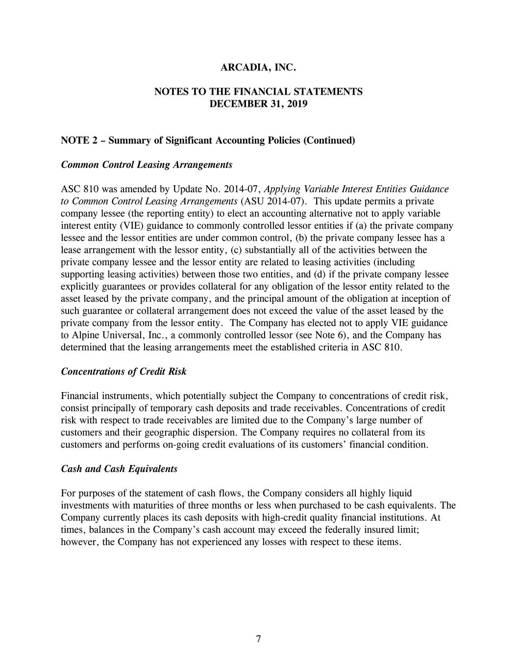 ARCADIA, INC. NOTES TO THE FINANCIAL STATEMENTS DECEMBER 31, 2019 7 NOTE 2 – Summary of Significant Accounting Policies (Continued) Common Control Leasing Arrangements ASC 810 was amended by Update No. 2014-07, Applying Variable Interest Entities Guidance to Common Control Leasing Arrangements (ASU 2014-07). This update permits a private company lessee (the reporting entity) to elect an accounting alternative not to apply variable interest entity (VIE) guidance to commonly controlled lessor entities if (a) the private company lessee and the lessor entities are under common control, (b) the private company lessee has a lease arrangement with the lessor entity, (c) substantially all of the activities between the private company lessee and the lessor entity are related to leasing activities (including supporting leasing activities) between those two entities, and (d) if the private company lessee explicitly guarantees or provides collateral for any obligation of the lessor entity related to the asset leased by the private company, and the principal amount of the obligation at inception of such guarantee or collateral arrangement does not exceed the value of the asset leased by the private company from the lessor entity. The Company has elected not to apply VIE guidance to Alpine Universal, Inc., a commonly controlled lessor (see Note 6), and the Company has determined that the leasing arrangements meet the established criteria in ASC 810. Concentrations of Credit Risk Financial instruments, which potentially subject the Company to concentrations of credit risk, consist principally of temporary cash deposits and trade receivables. Concentrations of credit risk with respect to trade receivables are limited due to the Company’s large number of customers and their geographic dispersion. The Company requires no collateral from its customers and performs on-going credit evaluations of its customers’ financial condition. Cash and Cash Equivalents For purposes of the statement of cash flows, the Company considers all highly liquid investments with maturities of three months or less when purchased to be cash equivalents. The Company currently places its cash deposits with high-credit quality financial institutions. At times, balances in the Company’s cash account may exceed the federally insured limit; however, the Company has not experienced any losses with respect to these items.