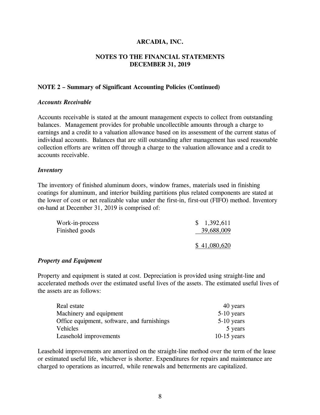 ARCADIA, INC. NOTES TO THE FINANCIAL STATEMENTS DECEMBER 31, 2019 8 NOTE 2 – Summary of Significant Accounting Policies (Continued) Accounts Receivable Accounts receivable is stated at the amount management expects to collect from outstanding balances. Management provides for probable uncollectible amounts through a charge to earnings and a credit to a valuation allowance based on its assessment of the current status of individual accounts. Balances that are still outstanding after management has used reasonable collection efforts are written off through a charge to the valuation allowance and a credit to accounts receivable. Inventory The inventory of finished aluminum doors, window frames, materials used in finishing coatings for aluminum, and interior building partitions plus related components are stated at the lower of cost or net realizable value under the first-in, first-out (FIFO) method. Inventory on-hand at December 31, 2019 is comprised of: Work-in-process $ 1,392,611 Finished goods 39,688,009 $ 41,080,620 Property and Equipment Property and equipment is stated at cost. Depreciation is provided using straight-line and accelerated methods over the estimated useful lives of the assets. The estimated useful lives of the assets are as follows: Real estate 40 years Machinery and equipment 5-10 years Office equipment, software, and furnishings 5-10 years Vehicles 5 years Leasehold improvements 10-15 years Leasehold improvements are amortized on the straight-line method over the term of the lease or estimated useful life, whichever is shorter. Expenditures for repairs and maintenance are charged to operations as incurred, while renewals and betterments are capitalized.