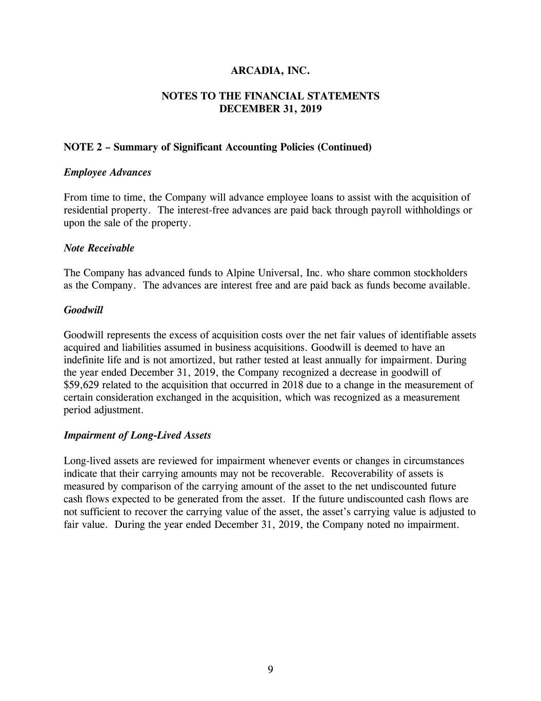 ARCADIA, INC. NOTES TO THE FINANCIAL STATEMENTS DECEMBER 31, 2019 9 NOTE 2 – Summary of Significant Accounting Policies (Continued) Employee Advances From time to time, the Company will advance employee loans to assist with the acquisition of residential property. The interest-free advances are paid back through payroll withholdings or upon the sale of the property. Note Receivable The Company has advanced funds to Alpine Universal, Inc. who share common stockholders as the Company. The advances are interest free and are paid back as funds become available. Goodwill Goodwill represents the excess of acquisition costs over the net fair values of identifiable assets acquired and liabilities assumed in business acquisitions. Goodwill is deemed to have an indefinite life and is not amortized, but rather tested at least annually for impairment. During the year ended December 31, 2019, the Company recognized a decrease in goodwill of $59,629 related to the acquisition that occurred in 2018 due to a change in the measurement of certain consideration exchanged in the acquisition, which was recognized as a measurement period adjustment. Impairment of Long-Lived Assets Long-lived assets are reviewed for impairment whenever events or changes in circumstances indicate that their carrying amounts may not be recoverable. Recoverability of assets is measured by comparison of the carrying amount of the asset to the net undiscounted future cash flows expected to be generated from the asset. If the future undiscounted cash flows are not sufficient to recover the carrying value of the asset, the asset’s carrying value is adjusted to fair value. During the year ended December 31, 2019, the Company noted no impairment.