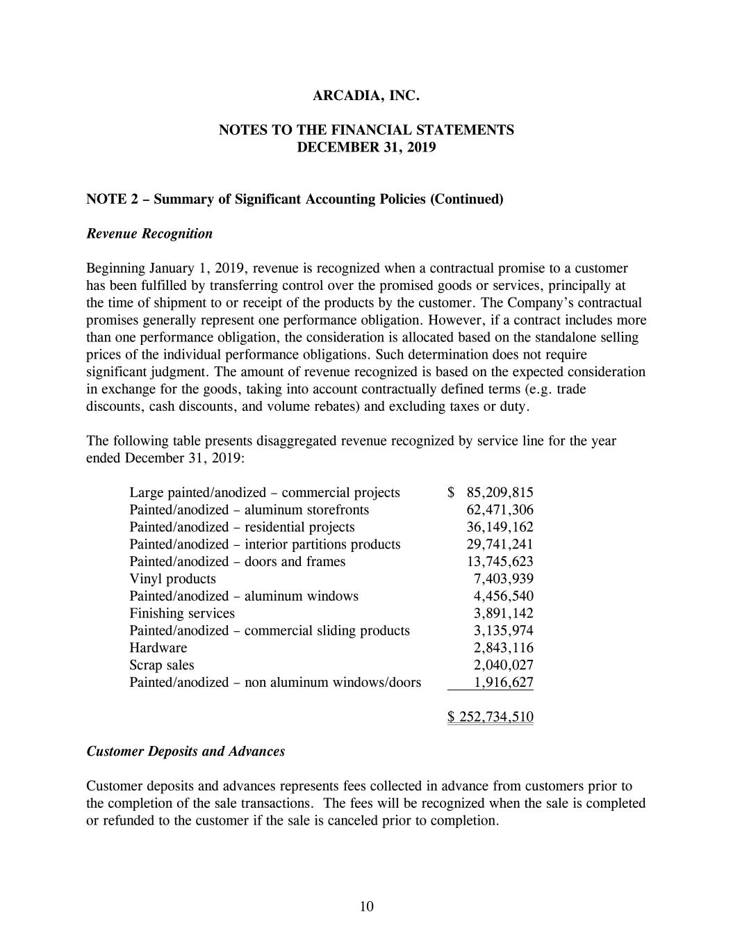 ARCADIA, INC. NOTES TO THE FINANCIAL STATEMENTS DECEMBER 31, 2019 10 NOTE 2 – Summary of Significant Accounting Policies (Continued) Revenue Recognition Beginning January 1, 2019, revenue is recognized when a contractual promise to a customer has been fulfilled by transferring control over the promised goods or services, principally at the time of shipment to or receipt of the products by the customer. The Company’s contractual promises generally represent one performance obligation. However, if a contract includes more than one performance obligation, the consideration is allocated based on the standalone selling prices of the individual performance obligations. Such determination does not require significant judgment. The amount of revenue recognized is based on the expected consideration in exchange for the goods, taking into account contractually defined terms (e.g. trade discounts, cash discounts, and volume rebates) and excluding taxes or duty. The following table presents disaggregated revenue recognized by service line for the year ended December 31, 2019: Large painted/anodized – commercial projects $ 85,209,815 Painted/anodized – aluminum storefronts 62,471,306 Painted/anodized – residential projects 36,149,162 Painted/anodized – interior partitions products 29,741,241 Painted/anodized – doors and frames 13,745,623 Vinyl products 7,403,939 Painted/anodized – aluminum windows 4,456,540 Finishing services 3,891,142 Painted/anodized – commercial sliding products 3,135,974 Hardware 2,843,116 Scrap sales 2,040,027 Painted/anodized – non aluminum windows/doors 1,916,627 $ 252,734,510 Customer Deposits and Advances Customer deposits and advances represents fees collected in advance from customers prior to the completion of the sale transactions. The fees will be recognized when the sale is completed or refunded to the customer if the sale is canceled prior to completion.