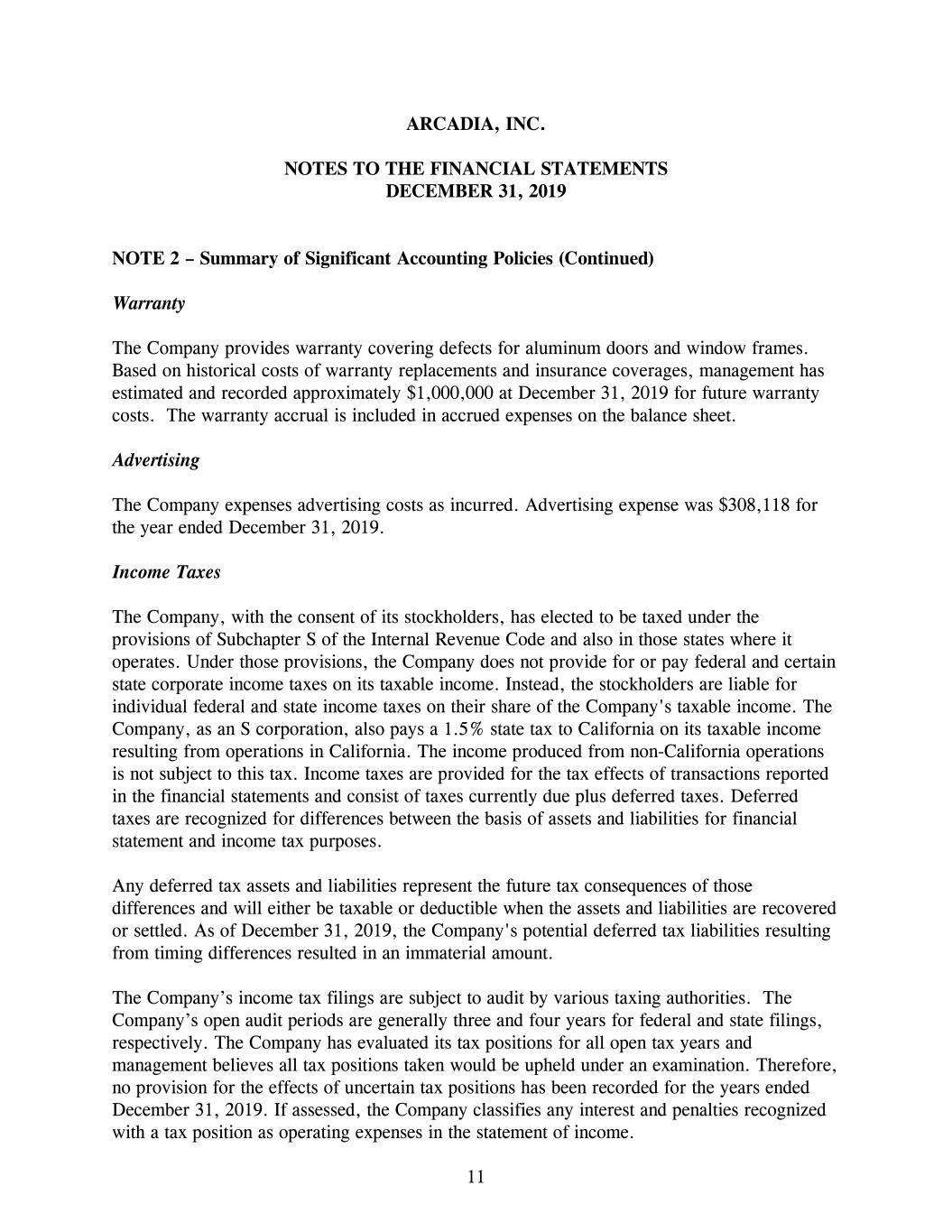 ARCADIA, INC. NOTES TO THE FINANCIAL STATEMENTS DECEMBER 31, 2019 11 NOTE 2 – Summary of Significant Accounting Policies (Continued) Warranty The Company provides warranty covering defects for aluminum doors and window frames. Based on historical costs of warranty replacements and insurance coverages, management has estimated and recorded approximately $1,000,000 at December 31, 2019 for future warranty costs. The warranty accrual is included in accrued expenses on the balance sheet. Advertising The Company expenses advertising costs as incurred. Advertising expense was $308,118 for the year ended December 31, 2019. Income Taxes The Company, with the consent of its stockholders, has elected to be taxed under the provisions of Subchapter S of the Internal Revenue Code and also in those states where it operates. Under those provisions, the Company does not provide for or pay federal and certain state corporate income taxes on its taxable income. Instead, the stockholders are liable for individual federal and state income taxes on their share of the Company's taxable income. The Company, as an S corporation, also pays a 1.5% state tax to California on its taxable income resulting from operations in California. The income produced from non-California operations is not subject to this tax. Income taxes are provided for the tax effects of transactions reported in the financial statements and consist of taxes currently due plus deferred taxes. Deferred taxes are recognized for differences between the basis of assets and liabilities for financial statement and income tax purposes. Any deferred tax assets and liabilities represent the future tax consequences of those differences and will either be taxable or deductible when the assets and liabilities are recovered or settled. As of December 31, 2019, the Company's potential deferred tax liabilities resulting from timing differences resulted in an immaterial amount. The Company’s income tax filings are subject to audit by various taxing authorities. The Company’s open audit periods are generally three and four years for federal and state filings, respectively. The Company has evaluated its tax positions for all open tax years and management believes all tax positions taken would be upheld under an examination. Therefore, no provision for the effects of uncertain tax positions has been recorded for the years ended December 31, 2019. If assessed, the Company classifies any interest and penalties recognized with a tax position as operating expenses in the statement of income.
