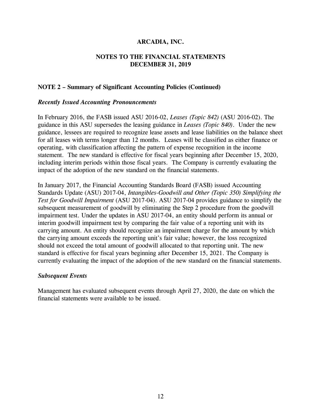 ARCADIA, INC. NOTES TO THE FINANCIAL STATEMENTS DECEMBER 31, 2019 12 NOTE 2 – Summary of Significant Accounting Policies (Continued) Recently Issued Accounting Pronouncements In February 2016, the FASB issued ASU 2016-02, Leases (Topic 842) (ASU 2016-02). The guidance in this ASU supersedes the leasing guidance in Leases (Topic 840). Under the new guidance, lessees are required to recognize lease assets and lease liabilities on the balance sheet for all leases with terms longer than 12 months. Leases will be classified as either finance or operating, with classification affecting the pattern of expense recognition in the income statement. The new standard is effective for fiscal years beginning after December 15, 2020, including interim periods within those fiscal years. The Company is currently evaluating the impact of the adoption of the new standard on the financial statements. In January 2017, the Financial Accounting Standards Board (FASB) issued Accounting Standards Update (ASU) 2017-04, Intangibles-Goodwill and Other (Topic 350) Simplifying the Test for Goodwill Impairment (ASU 2017-04). ASU 2017-04 provides guidance to simplify the subsequent measurement of goodwill by eliminating the Step 2 procedure from the goodwill impairment test. Under the updates in ASU 2017-04, an entity should perform its annual or interim goodwill impairment test by comparing the fair value of a reporting unit with its carrying amount. An entity should recognize an impairment charge for the amount by which the carrying amount exceeds the reporting unit’s fair value; however, the loss recognized should not exceed the total amount of goodwill allocated to that reporting unit. The new standard is effective for fiscal years beginning after December 15, 2021. The Company is currently evaluating the impact of the adoption of the new standard on the financial statements. Subsequent Events Management has evaluated subsequent events through April 27, 2020, the date on which the financial statements were available to be issued.