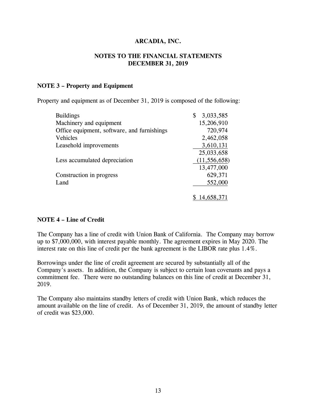 ARCADIA, INC. NOTES TO THE FINANCIAL STATEMENTS DECEMBER 31, 2019 13 NOTE 3 – Property and Equipment Property and equipment as of December 31, 2019 is composed of the following: Buildings $ 3,033,585 Machinery and equipment 15,206,910 Office equipment, software, and furnishings 720,974 Vehicles 2,462,058 Leasehold improvements 3,610,131 25,033,658 Less accumulated depreciation (11,556,658) 13,477,000 Construction in progress 629,371 Land 552,000 $ 14,658,371 NOTE 4 – Line of Credit The Company has a line of credit with Union Bank of California. The Company may borrow up to $7,000,000, with interest payable monthly. The agreement expires in May 2020. The interest rate on this line of credit per the bank agreement is the LIBOR rate plus 1.4%. Borrowings under the line of credit agreement are secured by substantially all of the Company's assets. In addition, the Company is subject to certain loan covenants and pays a commitment fee. There were no outstanding balances on this line of credit at December 31, 2019. The Company also maintains standby letters of credit with Union Bank, which reduces the amount available on the line of credit. As of December 31, 2019, the amount of standby letter of credit was $23,000.