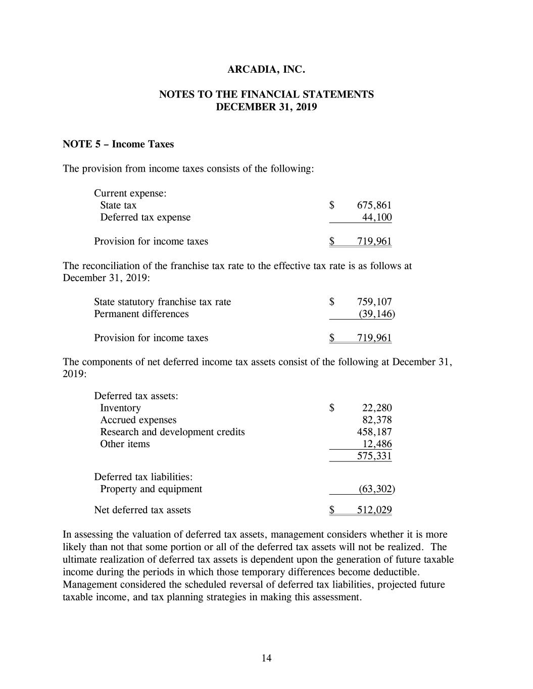 ARCADIA, INC. NOTES TO THE FINANCIAL STATEMENTS DECEMBER 31, 2019 14 NOTE 5 – Income Taxes The provision from income taxes consists of the following: Current expense: State tax $ 675,861 Deferred tax expense 44,100 Provision for income taxes $ 719,961 The reconciliation of the franchise tax rate to the effective tax rate is as follows at December 31, 2019: State statutory franchise tax rate $ 759,107 Permanent differences (39,146) Provision for income taxes $ 719,961 The components of net deferred income tax assets consist of the following at December 31, 2019: Deferred tax assets: Inventory $ 22,280 Accrued expenses 82,378 Research and development credits 458,187 Other items 12,486 575,331 Deferred tax liabilities: Property and equipment (63,302) Net deferred tax assets $ 512,029 In assessing the valuation of deferred tax assets, management considers whether it is more likely than not that some portion or all of the deferred tax assets will not be realized. The ultimate realization of deferred tax assets is dependent upon the generation of future taxable income during the periods in which those temporary differences become deductible. Management considered the scheduled reversal of deferred tax liabilities, projected future taxable income, and tax planning strategies in making this assessment.
