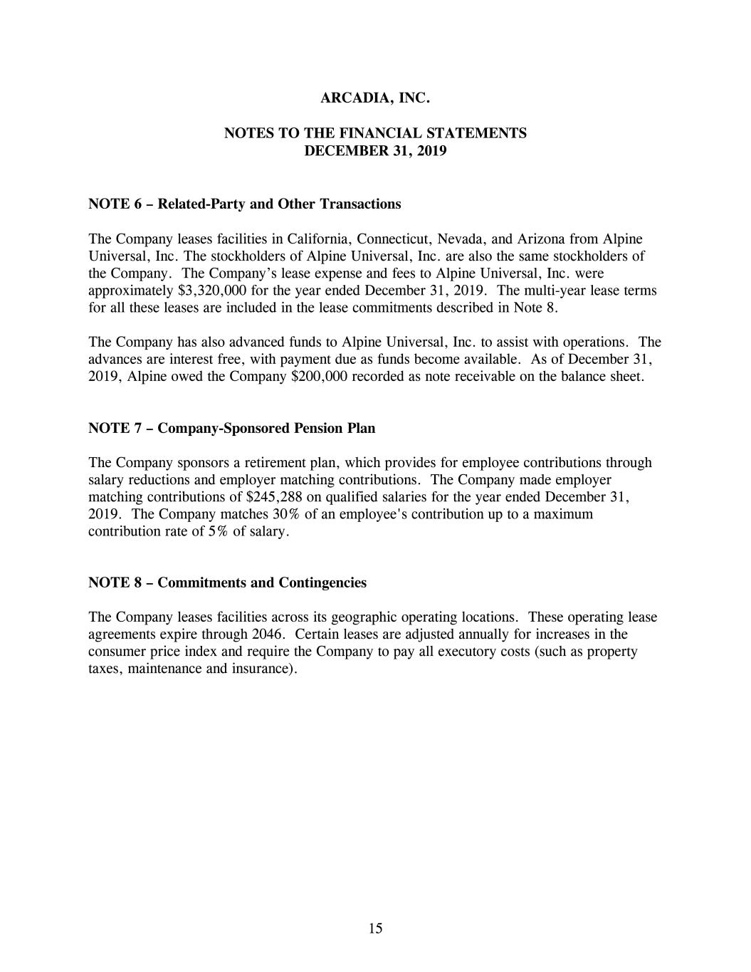 ARCADIA, INC. NOTES TO THE FINANCIAL STATEMENTS DECEMBER 31, 2019 15 NOTE 6 – Related-Party and Other Transactions The Company leases facilities in California, Connecticut, Nevada, and Arizona from Alpine Universal, Inc. The stockholders of Alpine Universal, Inc. are also the same stockholders of the Company. The Company’s lease expense and fees to Alpine Universal, Inc. were approximately $3,320,000 for the year ended December 31, 2019. The multi-year lease terms for all these leases are included in the lease commitments described in Note 8. The Company has also advanced funds to Alpine Universal, Inc. to assist with operations. The advances are interest free, with payment due as funds become available. As of December 31, 2019, Alpine owed the Company $200,000 recorded as note receivable on the balance sheet. NOTE 7 – Company-Sponsored Pension Plan The Company sponsors a retirement plan, which provides for employee contributions through salary reductions and employer matching contributions. The Company made employer matching contributions of $245,288 on qualified salaries for the year ended December 31, 2019. The Company matches 30% of an employee's contribution up to a maximum contribution rate of 5% of salary. NOTE 8 – Commitments and Contingencies The Company leases facilities across its geographic operating locations. These operating lease agreements expire through 2046. Certain leases are adjusted annually for increases in the consumer price index and require the Company to pay all executory costs (such as property taxes, maintenance and insurance).