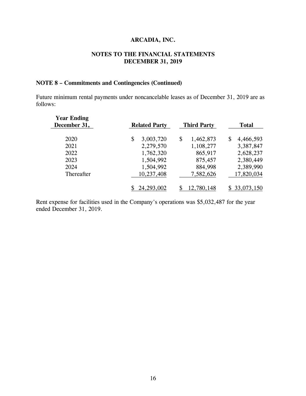 ARCADIA, INC. NOTES TO THE FINANCIAL STATEMENTS DECEMBER 31, 2019 16 NOTE 8 – Commitments and Contingencies (Continued) Future minimum rental payments under noncancelable leases as of December 31, 2019 are as follows: Year Ending December 31, Related Party Third Party Total 2020 $ 3,003,720 $ 1,462,873 $ 4,466,593 2021 2,279,570 1,108,277 3,387,847 2022 1,762,320 865,917 2,628,237 2023 1,504,992 875,457 2,380,449 2024 1,504,992 884,998 2,389,990 Thereafter 10,237,408 7,582,626 17,820,034 $ 24,293,002 $ 12,780,148 $ 33,073,150 Rent expense for facilities used in the Company's operations was $5,032,487 for the year ended December 31, 2019.