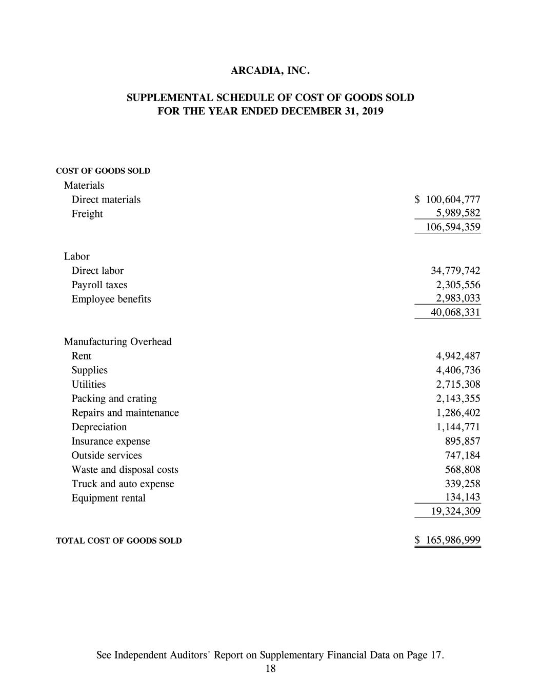 ARCADIA, INC. SUPPLEMENTAL SCHEDULE OF COST OF GOODS SOLD FOR THE YEAR ENDED DECEMBER 31, 2019 COST OF GOODS SOLD Materials Direct materials 100,604,777$ Freight 5,989,582 106,594,359 Labor Direct labor 34,779,742 Payroll taxes 2,305,556 Employee benefits 2,983,033 40,068,331 Manufacturing Overhead Rent 4,942,487 Supplies 4,406,736 Utilities 2,715,308 Packing and crating 2,143,355 Repairs and maintenance 1,286,402 Depreciation 1,144,771 Insurance expense 895,857 Outside services 747,184 Waste and disposal costs 568,808 Truck and auto expense 339,258 Equipment rental 134,143 19,324,309 TOTAL COST OF GOODS SOLD 165,986,999$ See Independent Auditors' Report on Supplementary Financial Data on Page 17. 18