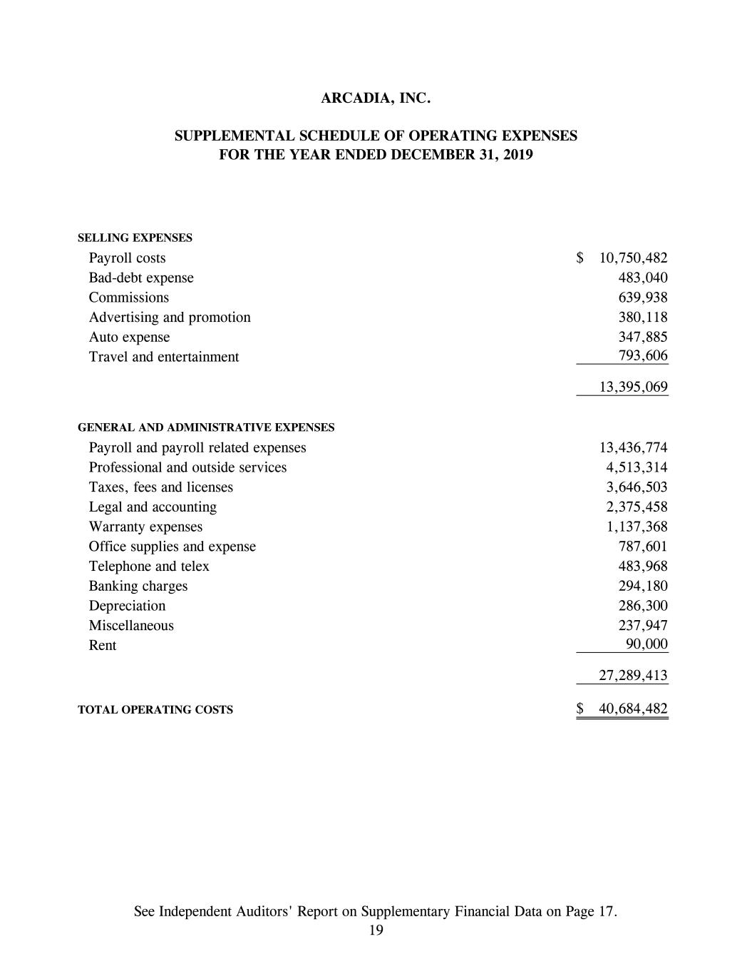 ARCADIA, INC. SUPPLEMENTAL SCHEDULE OF OPERATING EXPENSES FOR THE YEAR ENDED DECEMBER 31, 2019 SELLING EXPENSES Payroll costs 10,750,482$ Bad-debt expense 483,040 Commissions 639,938 Advertising and promotion 380,118 Auto expense 347,885 Travel and entertainment 793,606 13,395,069 GENERAL AND ADMINISTRATIVE EXPENSES Payroll and payroll related expenses 13,436,774 Professional and outside services 4,513,314 Taxes, fees and licenses 3,646,503 Legal and accounting 2,375,458 Warranty expenses 1,137,368 Office supplies and expense 787,601 Telephone and telex 483,968 Banking charges 294,180 Depreciation 286,300 Miscellaneous 237,947 Rent 90,000 27,289,413 TOTAL OPERATING COSTS 40,684,482$ See Independent Auditors' Report on Supplementary Financial Data on Page 17. 19